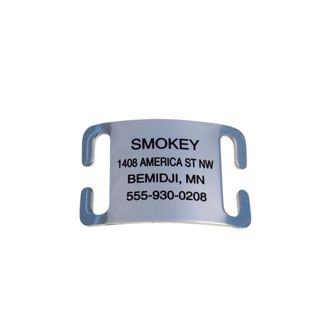 All text is centered and sized to fit the tag, and will be engraved in all capital letters for easy legibility. The top line (usually the pet name) is made slightly larger. If you would like a different arrangement, please call to inquire.