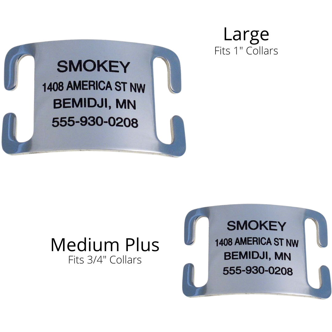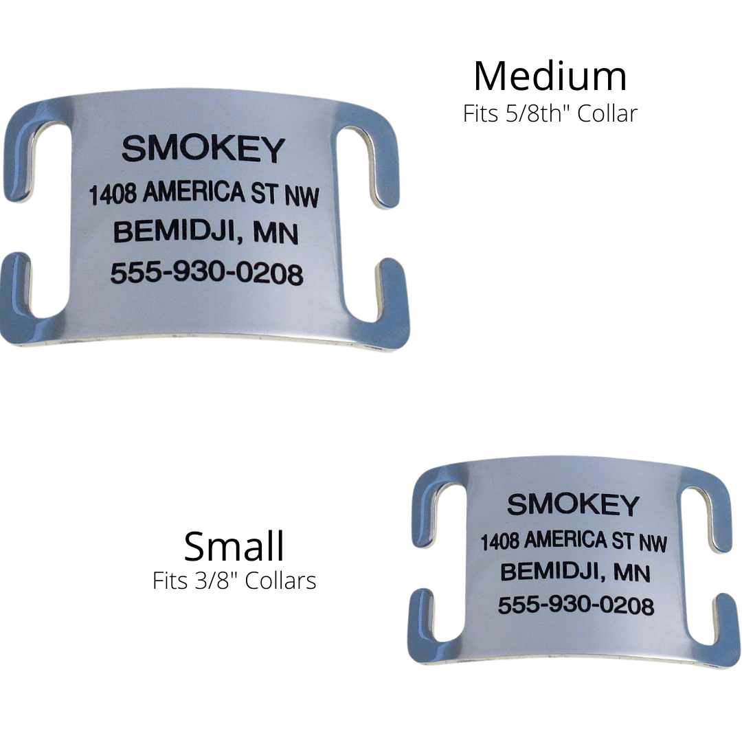 4 Sizes: to fit collars 3/8”, 5/8", 3/4" or 1" wide (no more than 1/8" thick)